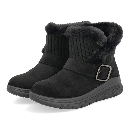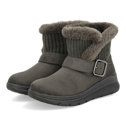 ニットとファーをあしらった履き口は見た目にもあたたかで、ふんわりと愛らしいシルエット。甲に渡るベルトがそれをハンサムに引き締めていて、パンツスタイルにもよく似合います。