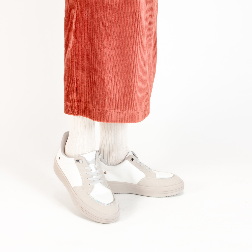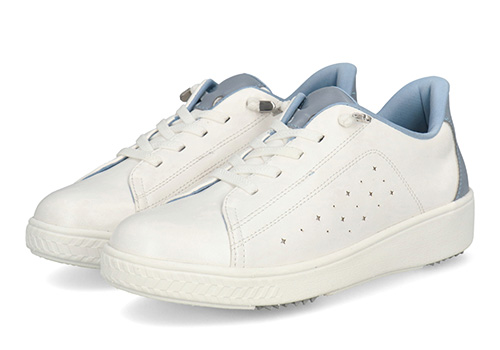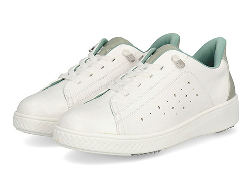清楚で落ち着いた色合いとシンプルベーシックなスタイルで、何にでも合わせやすく日常使いできるコンフォートスニーカー。パンチングはさりげなく星型で、ほんのりとした可愛らしさも魅力。艶のあるアッパーが高級感を演出します。